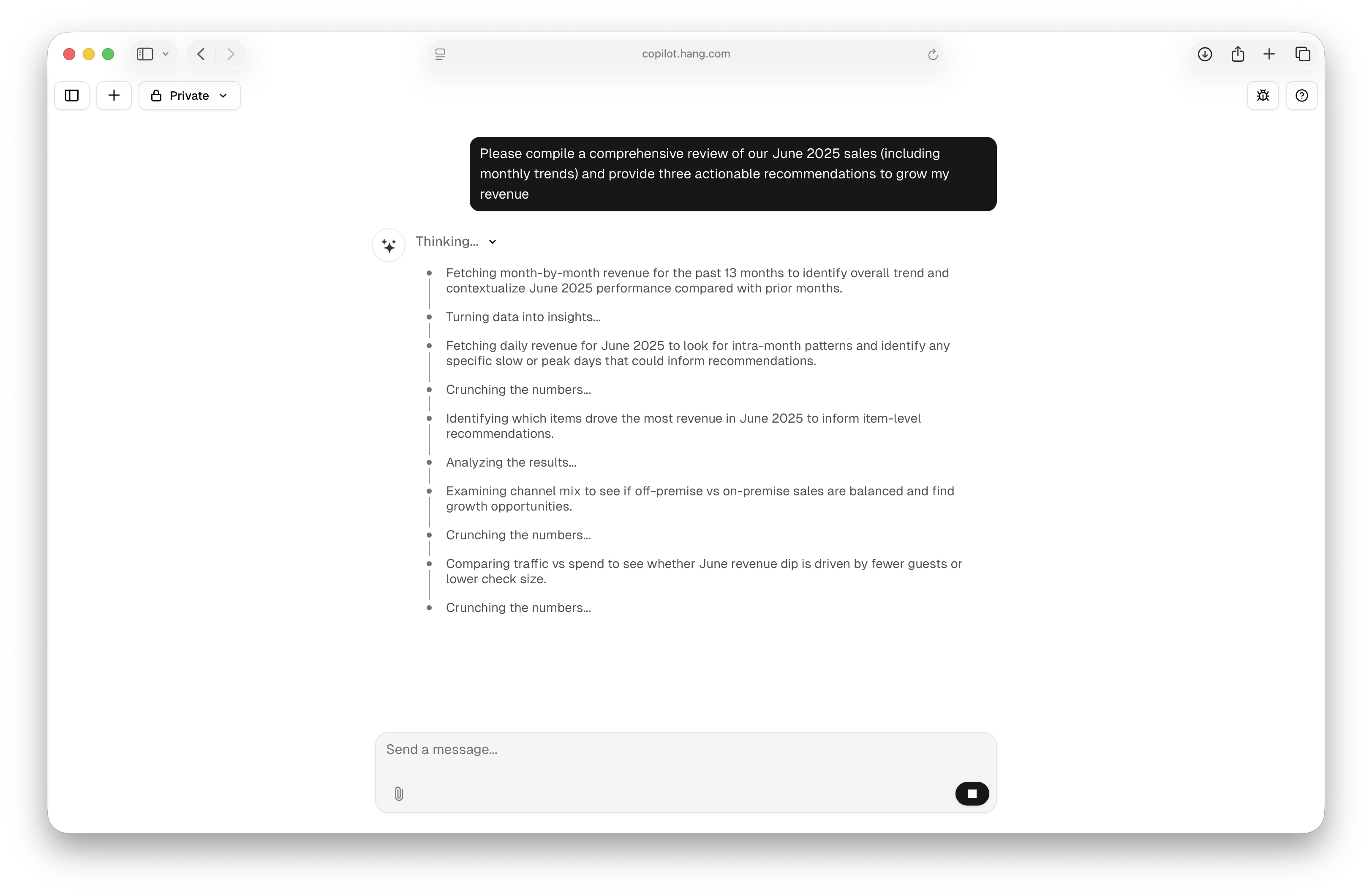 The Copilot chat is now powered by a chat model with higher reasoning ability. This means it will make more frequent and targeted analysis of your business data when generating responses, as well as provide more thoughtful and creative recommendations. You can also expect the chat to be more accurate, especially to complex questions.